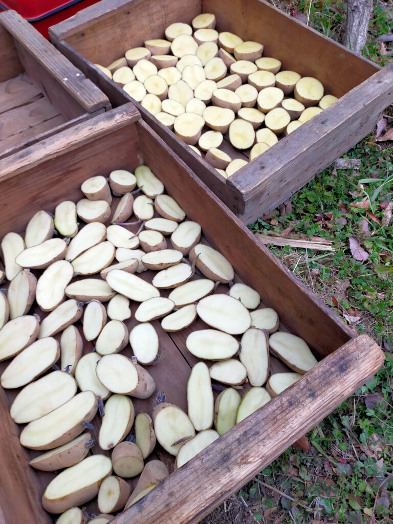 ジャガイモを半分に切り芽出し中です。